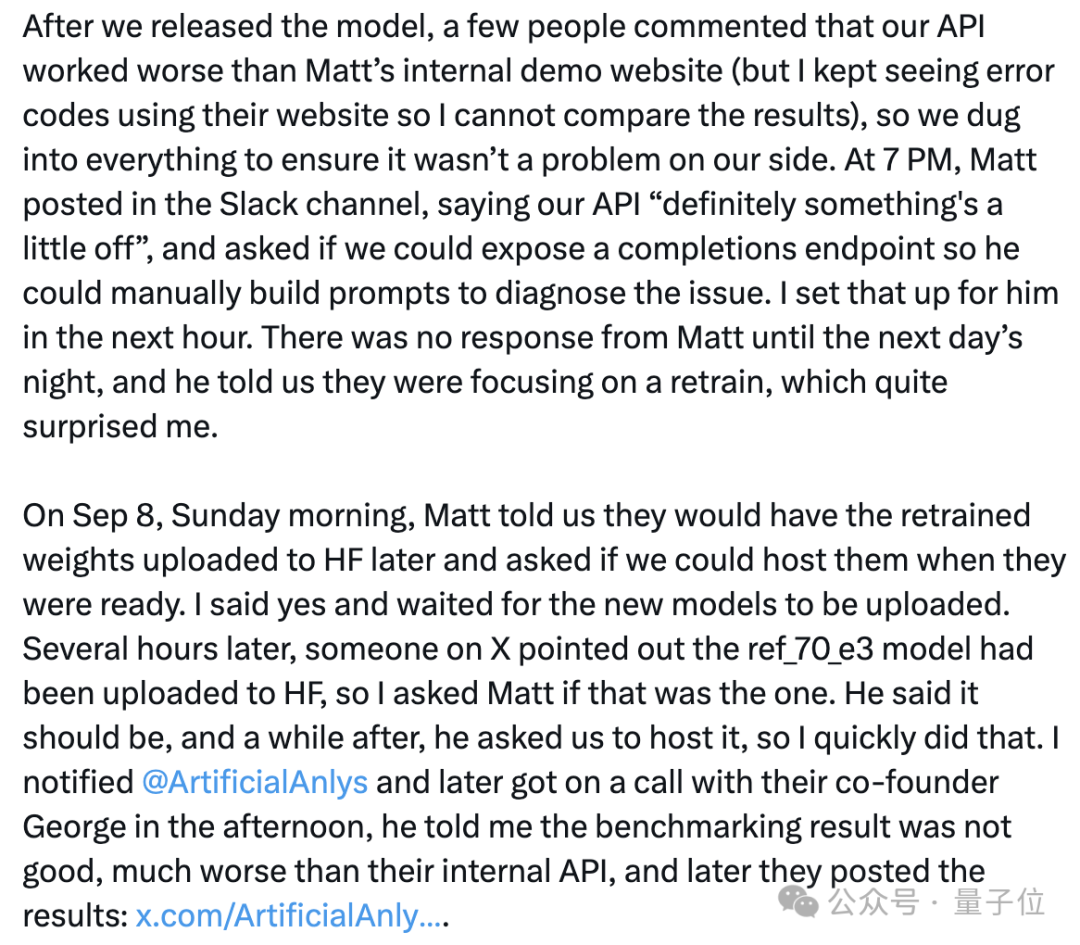 後來,Hyperbolic上的模型就出現了成績與Reflection宣傳不符的情況,Shumer認為這是Hyperbolic的API出現了問題。