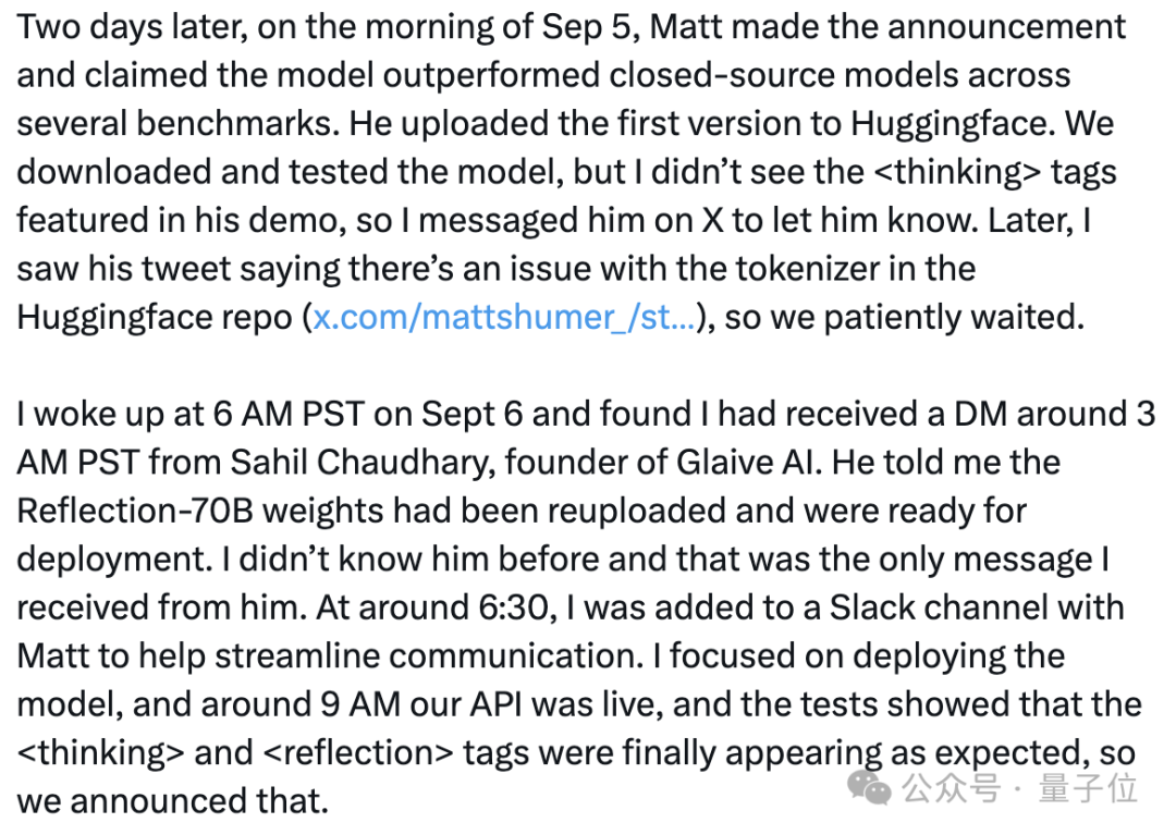 9月5號,Reflection正式上線,Hyperbolic從Hugging Face下載並測試了該模型,但並沒有看到標籤,於是Jin給Shumer發了私信。