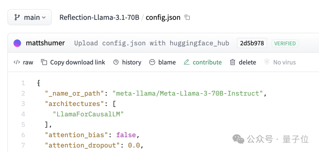 在Hugging Face上,Reflection的JSON文件中也顯示是Llama 3而非3.1。