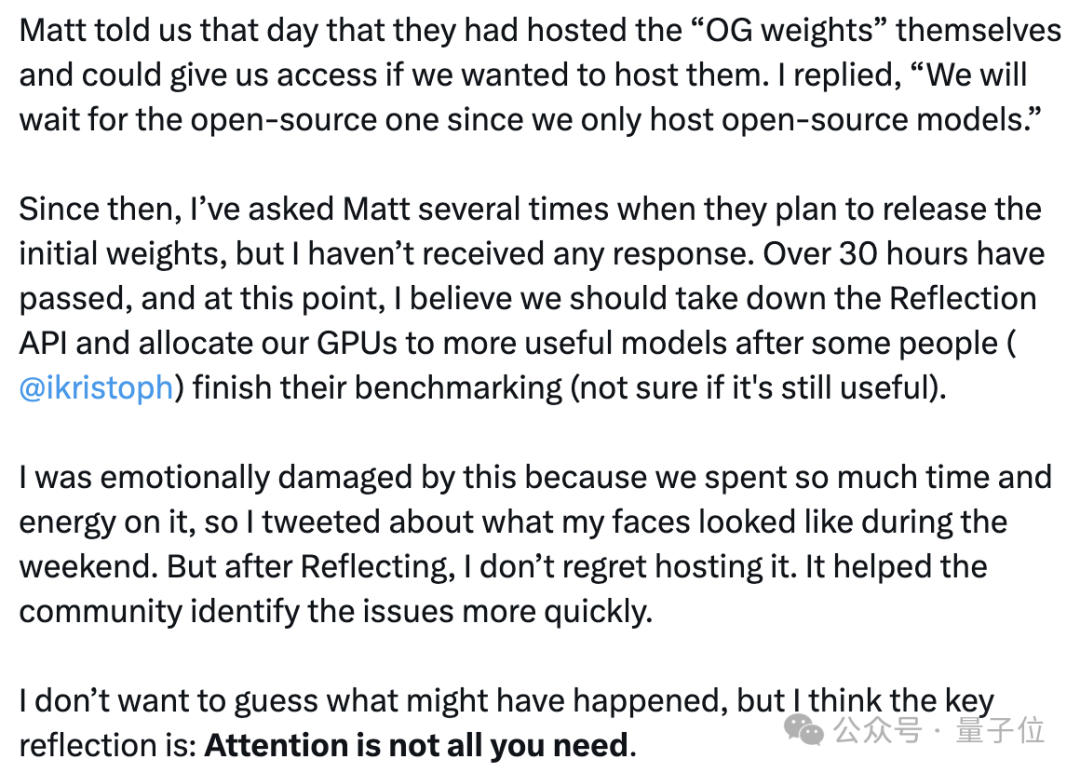 但Jin沒有同意這一要求,因為Hyperbolic只為開源模型提供託管服務,之後不斷詢問Shumer原始權重何時發佈,但遲遲未得到回應。