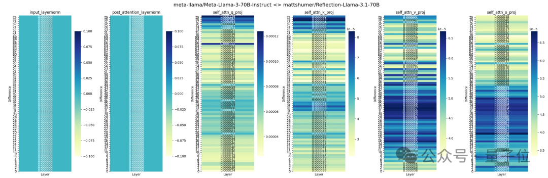 除了成績有爭議,還有人對Reflection中的各層進行了分析,認為它是由Llama 3經過LoRA改造而來,而不是官方所聲稱的Llama 3.1。