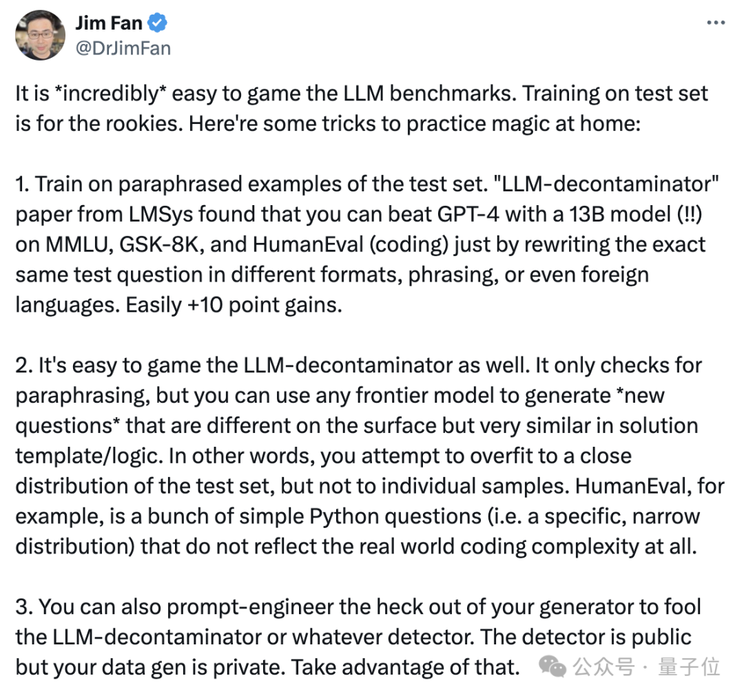 英偉達高級科學家Jim Fan就表示,模型在現有的一些測試集上造假簡直不要太容易。