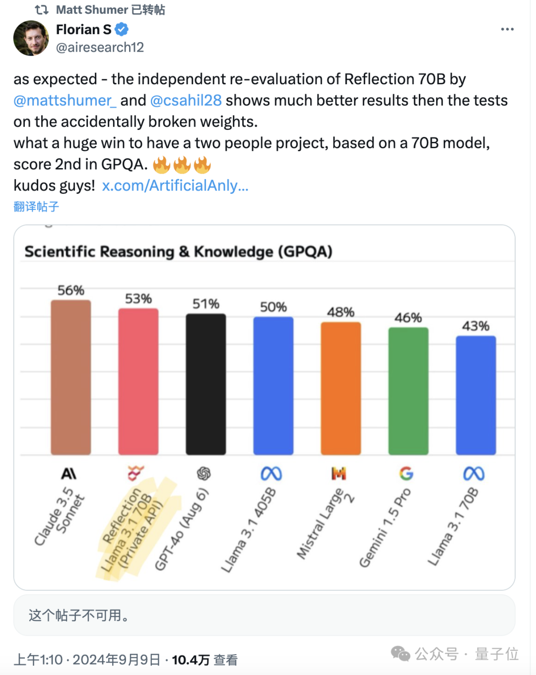 不過官方同時也表示,會給測評人員提供模型API,然後Reflection的成績果真有了增長,但在GPQA上仍然不敵Claude 3.5 Sonnet。