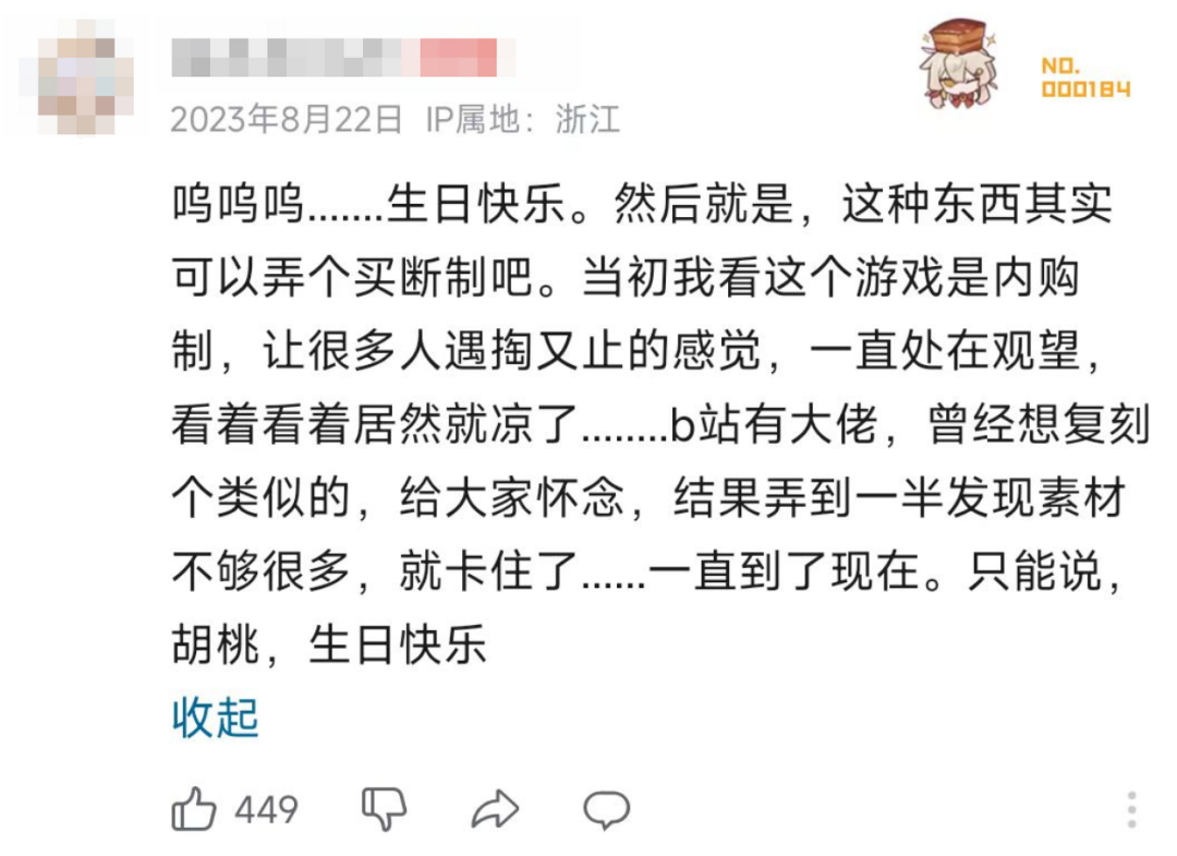 這些可能都沒那麼有所謂了。對熊吉自己來説,把《胡桃日記》做下去無所謂堅持,也沒那麼看重營收,只是一件理所當然的事情,有點像是二次元玩家常説的“為愛發電”。也許最初想法誕生於表情包的熱度和治癒,但如今他已經把胡桃當作身邊一個熟悉的朋友。