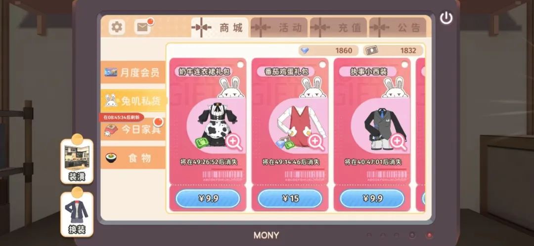 另一方面,去除大量冗餘內容後,遊戲目前也依舊還沒能圍繞“陪伴類產品”概念找到一套合適的商業化模式。目前他們最核心的收入模式還是賣皮膚,表現在遊戲中,就是不時彈出各種各樣的禮包,觀感並不好。