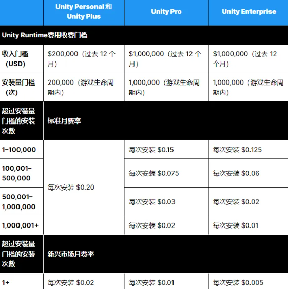 按照Unity官方的計劃,他們之後會根據使用Unity開發的遊戲軟件的安裝次數,向開發商收取相應的安裝費用,算是在原本的引擎訂閲費之外,新增了額外的“税款”。