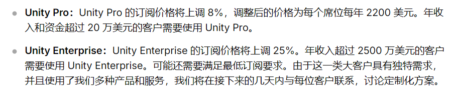 具體來説,年收入、資金流水超過20萬美元的用户,需要訂閲Unity Pro,訂閲價格將上調 8%,調整後每個用户位的年費為2200美元;流水過2500萬美元的客户,這一檔的Unity Enterprise 漲價25%,鑑於這種體量的客户訂閲方案通常比較複雜,具體到時怎麼去漲,Unity表示會和客户具體再溝通。