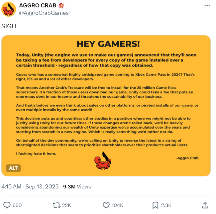 消息一出,許多使用Unity的開發商表示無法接受,包括《咩咩啓示錄》《蟹蟹尋寶奇遇記》等一票知名的獨立遊戲開發商,按照Unity的規則來算,開發者的產品只能賣一次,但下載可能導致反覆交錢,意味着收入減少,甚至產品可能賺不到錢,還要向Unity倒貼。