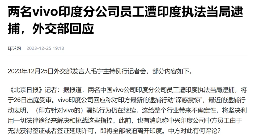 小米,OPPO, VIVO等在印度的中國企業都遭受了各種司法調查,vivo甚至在2023年12月被逮捕了兩名員工,包括一名中國籍的VIVO 印度臨時CEO,和一名印度籍的vivo 印度CFO,另外還逮捕了一個外部顧問。