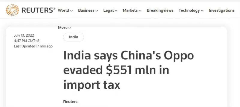 而OPPO也被印度指責逃避關税,下圖是2022年7月13日路透社的報道,印度指控説oppo逃税439億盧比(摺合當時5.51億美元),