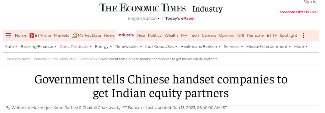 下圖是2023年6月13日印度經濟時報的一篇報道,説印度政府告知中國手機公司不能是獨資,而是要出售一部分股權給印度公司。