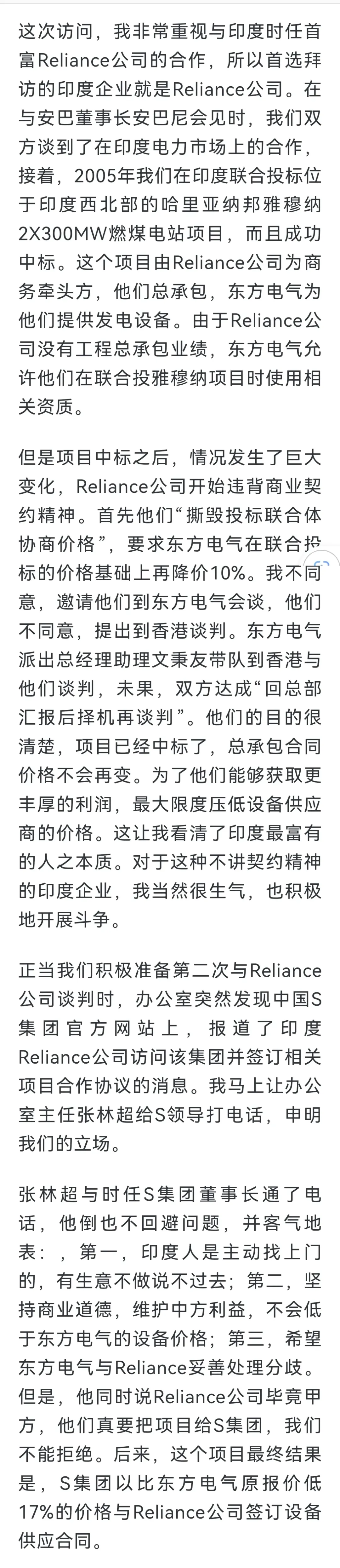 當年2005年在聯合投標已經中標的情況下,印度人撕毀之前談好的價格,逼迫東方電氣降價10%,東方電氣不同意,結果印度人跑去找了國內另外一家電力設備集團S公司。S集團對找上門來的生意沒有選擇拒絕,而是給出了低於東方電氣17%的價格並簽訂了設備合同。後來S集團和reliance簽署了更大規模的合同,也產生了各種糾紛,以至於S集團不得不耗費時間精力和Riliance公司對簿公堂討要欠款。