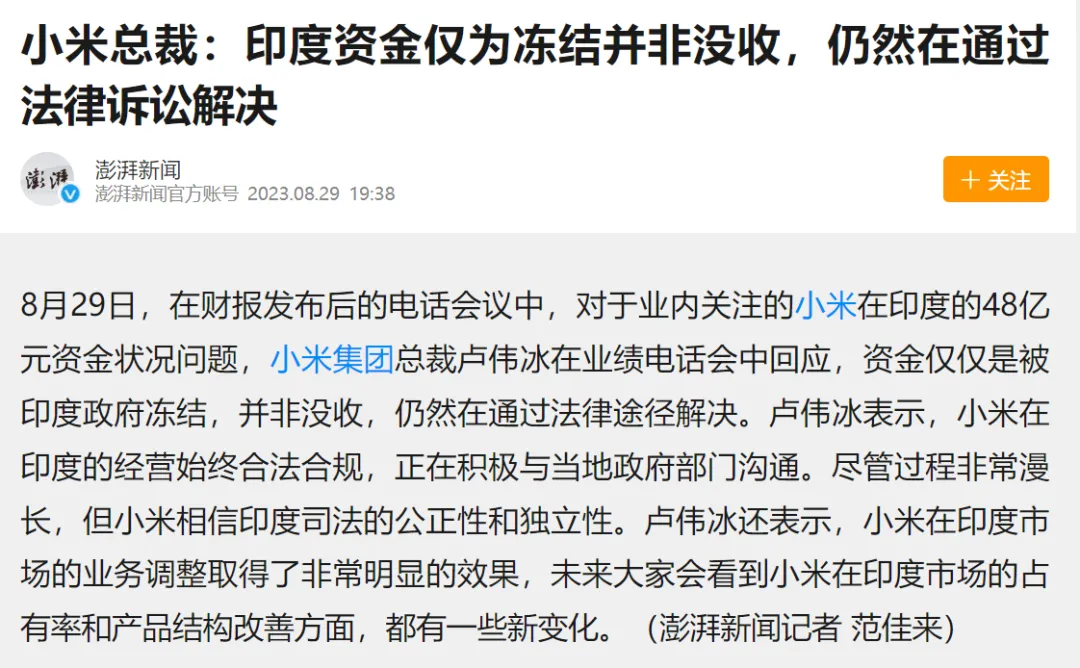 儘管之後一度有報道説印度政府已經解除了凍結,但後來直到2023年8月29日,根據小米總裁的回應,仍在想辦法通過法律途徑解決。