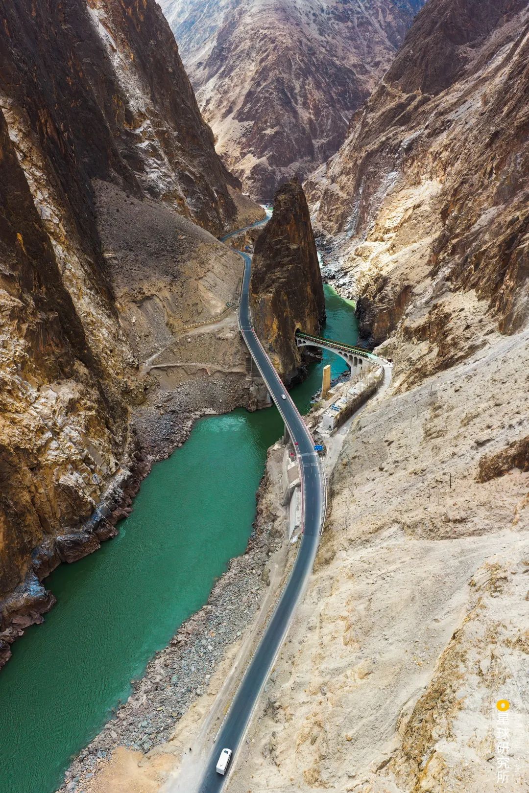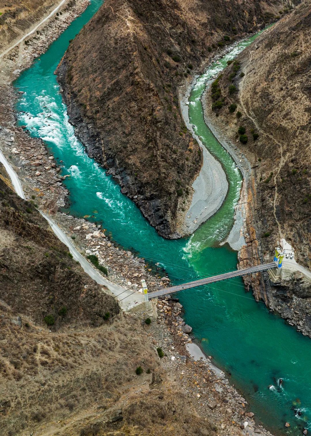 (八宿怒江大橋,中間未拆除的舊橋墩如一座豐碑紀念烈士,攝影師@曹鐵)