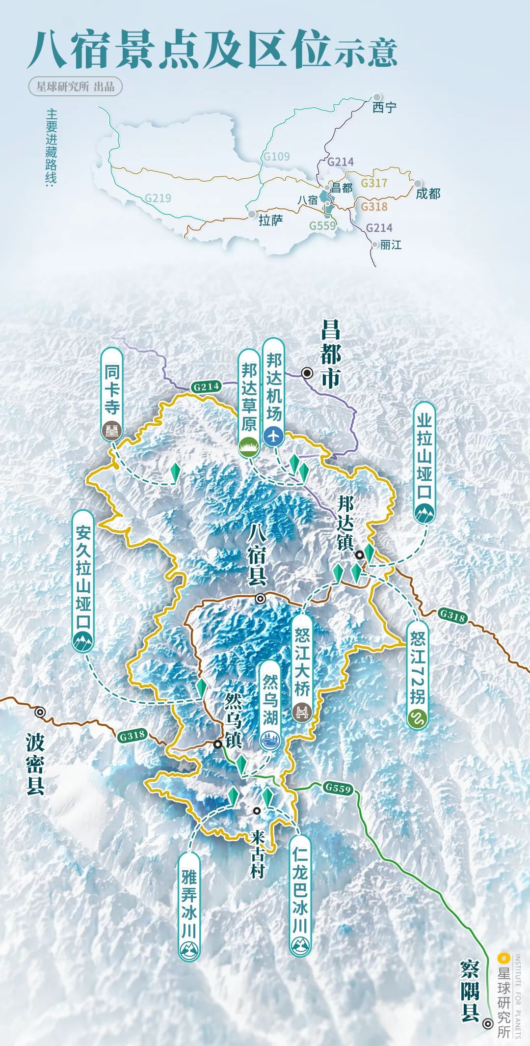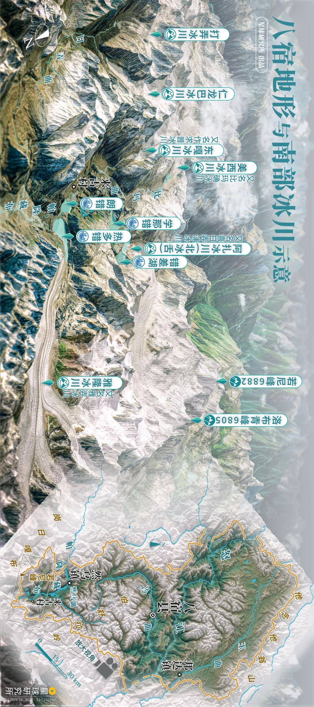 (請橫屏觀看,八宿地形與南部冰川示意,製圖@陳志浩/星球研究所)