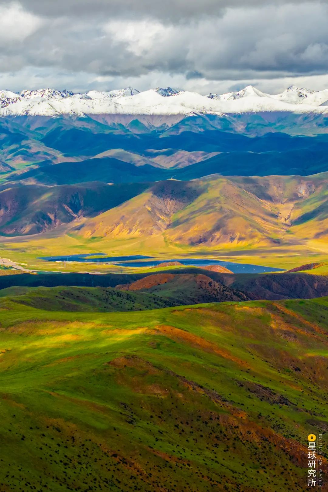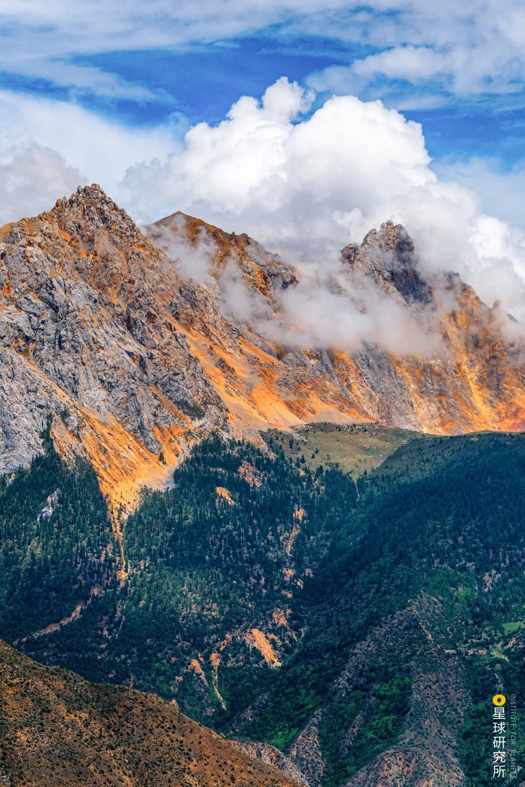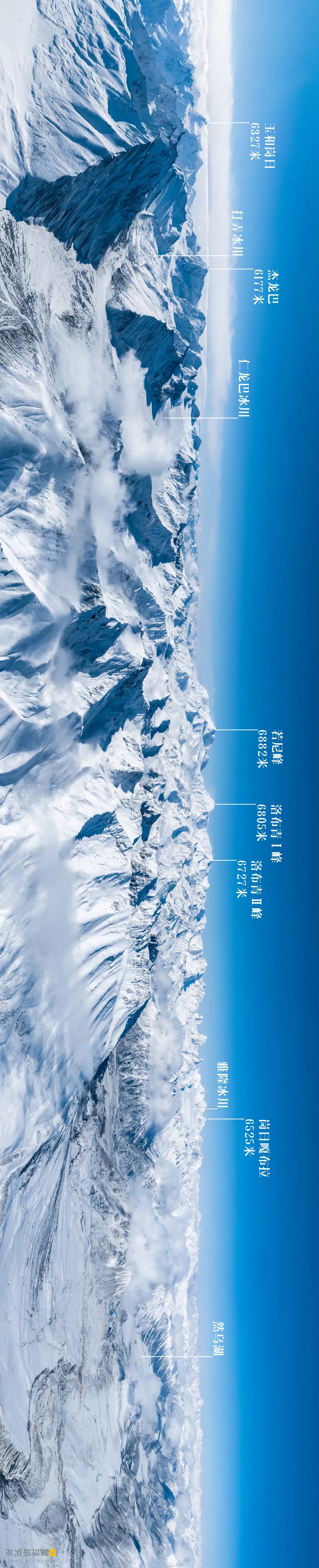 (請橫屏觀看,由北向南眺望崗日嘎布山脈“雪嶺長城”,攝影師@阿怪Zax,標註@梯田/星球研究所)