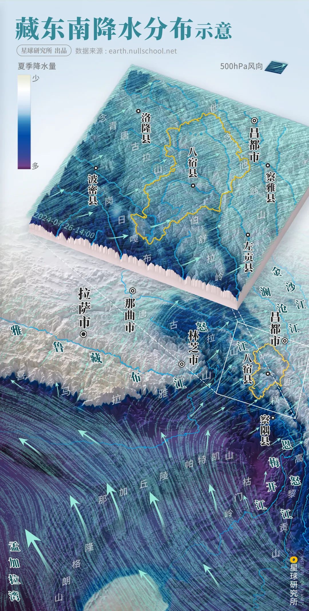 (藏東南降水分佈示意,八宿縣海拔3200多米,圖中500pha風向為海拔5500米左右的氣流軌跡,製圖@陳志浩/星球研究所)