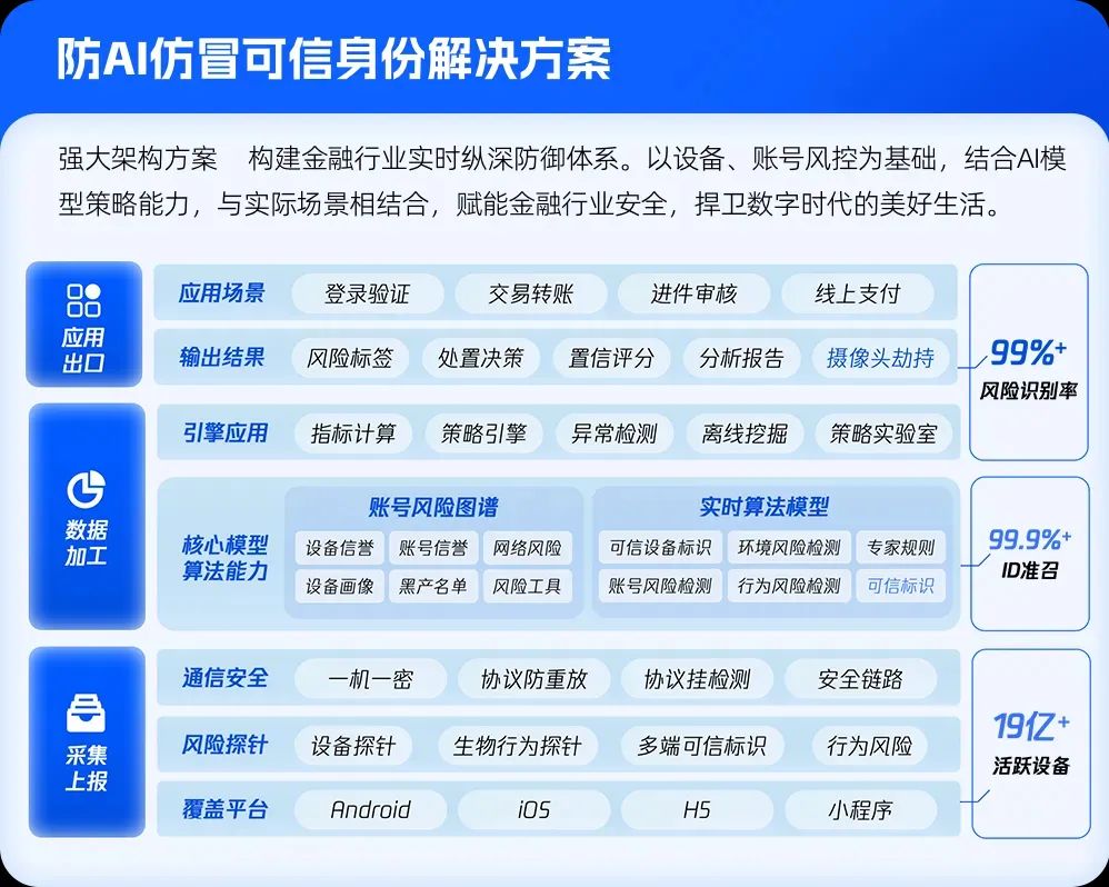 在登錄驗證、交易轉賬、進件審核、線上支付等應用場景,這套解決方案的風險識別率達到了99%+。