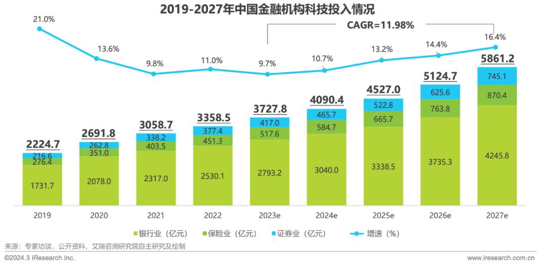 艾瑞諮詢在《2024年中國金融科技行業發展洞察報告》中預測,2023-2027年,國內金融科技市場預計將以約12%的增速,於2027年突破5800億元,增速也將連年擴大。