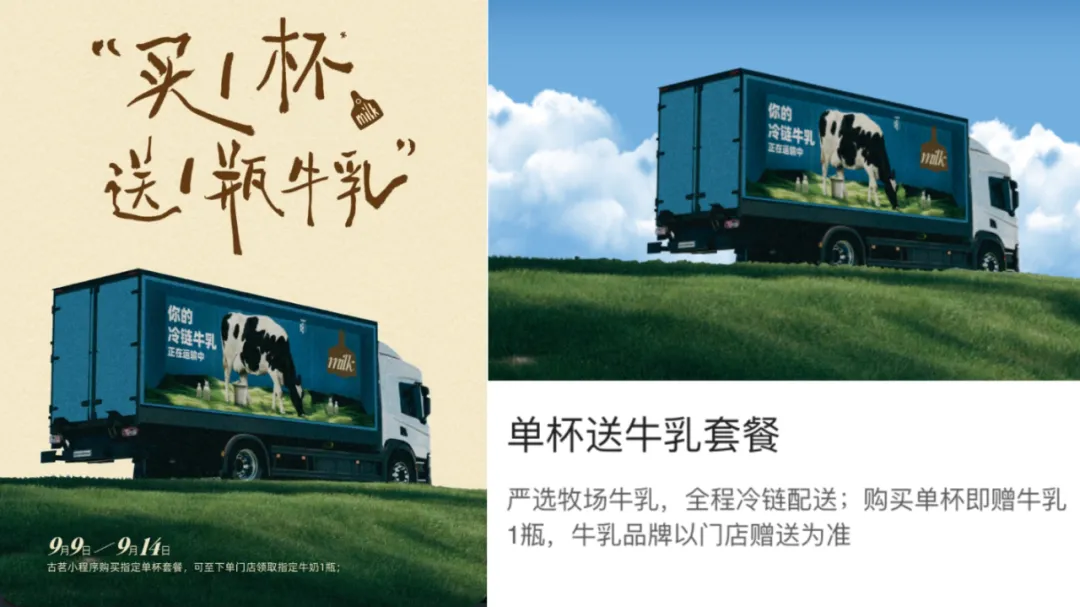隨後,古茗官方小紅書賬號發佈“買一杯送一瓶”活動:9月9日-9月14日,全國9000多家門店上線“單杯送牛奶套餐”,購買指定套餐即可贈送一瓶冷藏牛乳。