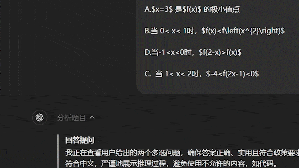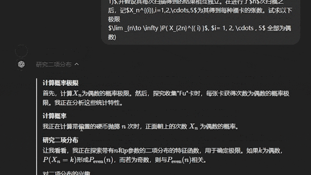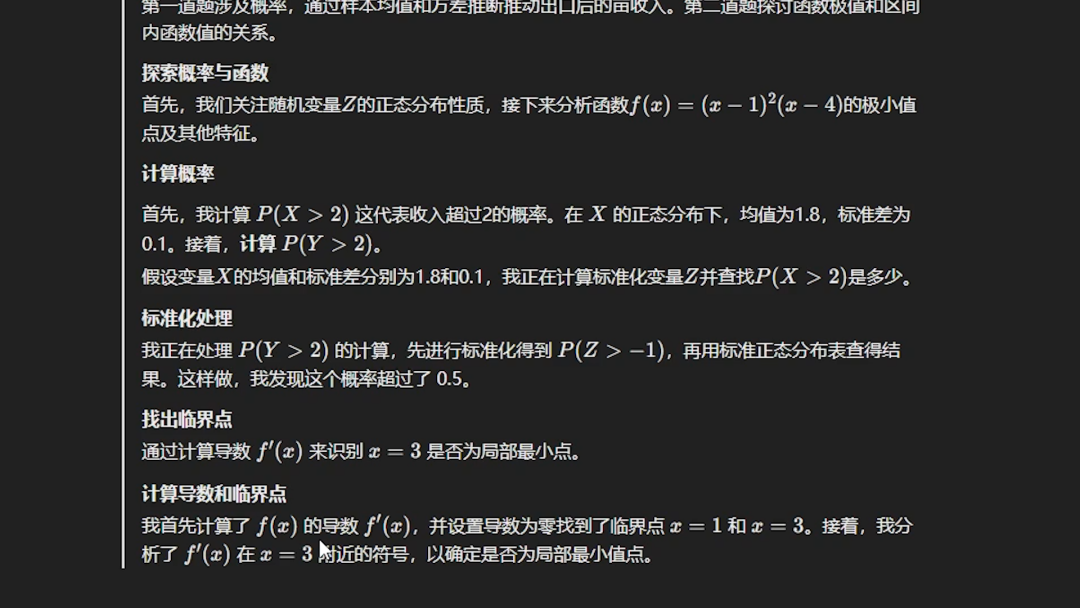 在題目輸入對話框後,可以看到o1比普通大模型多了一個思考的過程。比如上圖這道高考數學的多選題,它會先分析題目,然後再找需要用到知識。以這道題來講,需要用的就是正態分佈的知識,然後再去計算概率。