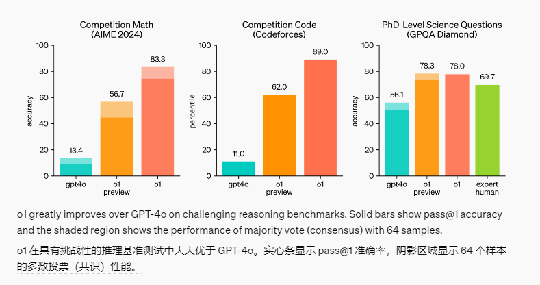 根據官方的介紹,o1在推理相關的問題上,比GPT4o有着大幅度的提升。比如針對美國最****聰明高中生的數學測試中,以前GPT4o平均只能在15道題答對1.8道,而o1的正確數量飆升到了12.5,如果微調下,o1可以超過美國高中生數學奧林匹克的分數線。