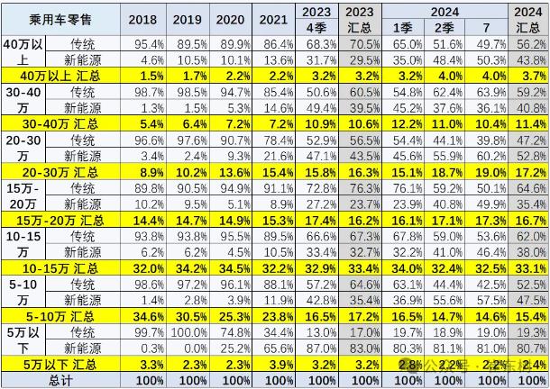 3、不要小瞧老百姓的消費能力,雖然近幾年車企大打價格戰,但車市價格反而呈現逐年上升的態勢。2019年均價是14.2萬元,2020年均價為15.3萬,今年均價是17.9萬元,7月份為18.2萬。二季度和7月份單價15萬以上的乘用車零售銷量佔比均超過50%,單價10萬以下的乘用車銷量佔比還不到17%。