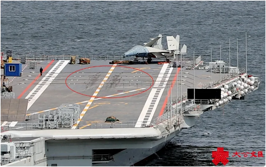 今年4月,遼寧艦海試回來後,香港媒體發現它的飛行甲板上出現了艦載機着陸的痕跡。從輪胎在飛行甲板上留下的痕跡間隔判斷,該艦載機的輪胎間隔應該比殲-15更小——或者説,具備這種特徵,能夠在遼寧艦上攔阻降落的型號,其實也就只有殲-35了。