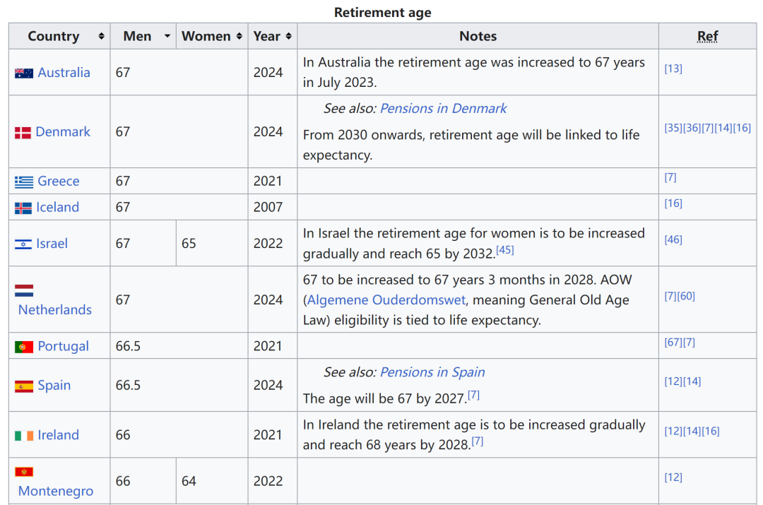 6)從全世界範圍看,男性退休年齡最高的是澳大利亞,達到了67歲。退休年齡最高的10個國家和地區,男性退休年齡都在66-67歲之間。順便説一下,中國的台灣省,目前男性退休年齡是66歲,到2028年將逐步提高到68歲。