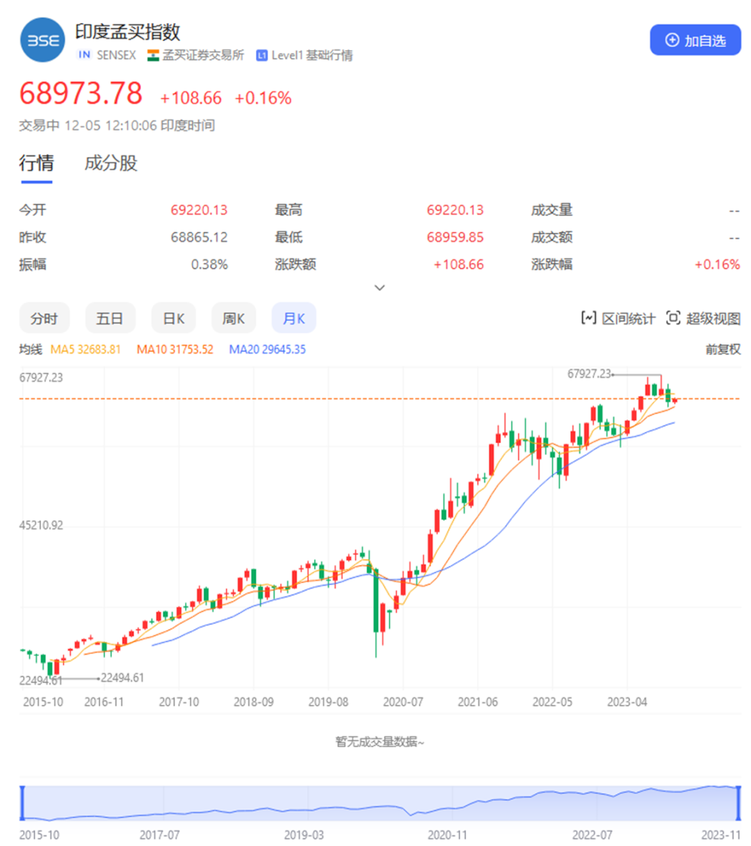 實際上,印度股市在過去幾十年裏一直在突飛猛進,像印度孟買指數,如果從走勢圖上來看,在2015年至2023年這段期間裏,除了2019年8月至2020年7月這段時間裏跌了一次以外,其他時候指數一直在不停地往上走。