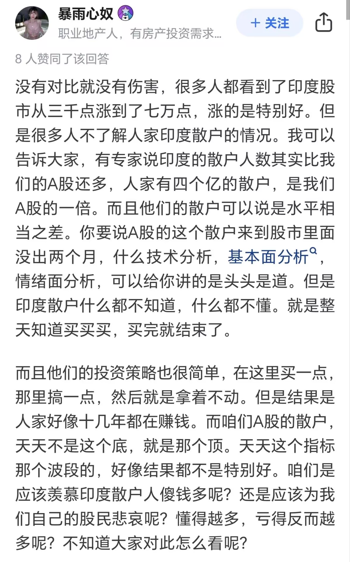 不過,網上還有人認為,印度股市之所以好,是因為印度股市中的散户要比我們這裏多得多。大概有4個億。而那邊的投資策略就是這裏買一點,那裏高一點,然後就是拿着不動。