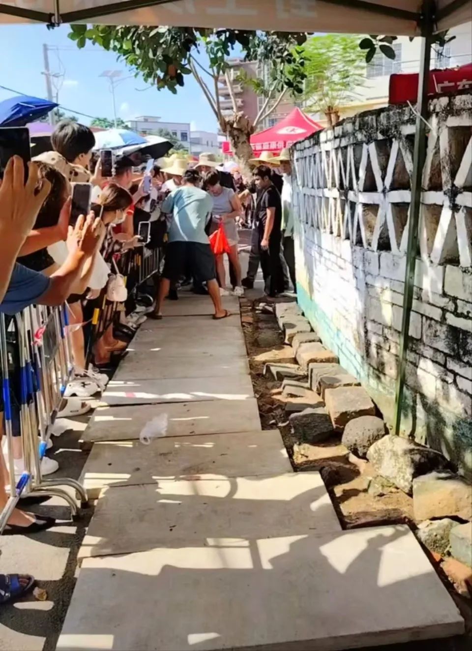 據湛江發佈消息,茂名人陳輝(化名)13日一早便驅車到邁合村,村口的停車場已經停滿了遊客車輛。陳輝説,當天上午全紅嬋爺爺家門外圍滿了遊客,目測有幾千人,村裏在門外3米左右的地方設置了一排圍欄,讓遊客站在圍欄外。此外,村裏的小吃攤又多了起來。為維持秩序,當地派出大量工作人員在邁合村進行安全保障,村裏有公安、城管等多部門工作人員在巡邏值守。