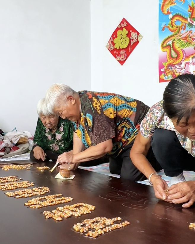 在黑龍江伊春,村裏的老婆婆們得知這一消息後,迅速聚到一起,着急趕工,將老玉米一粒粒剝離,再粘在一起。