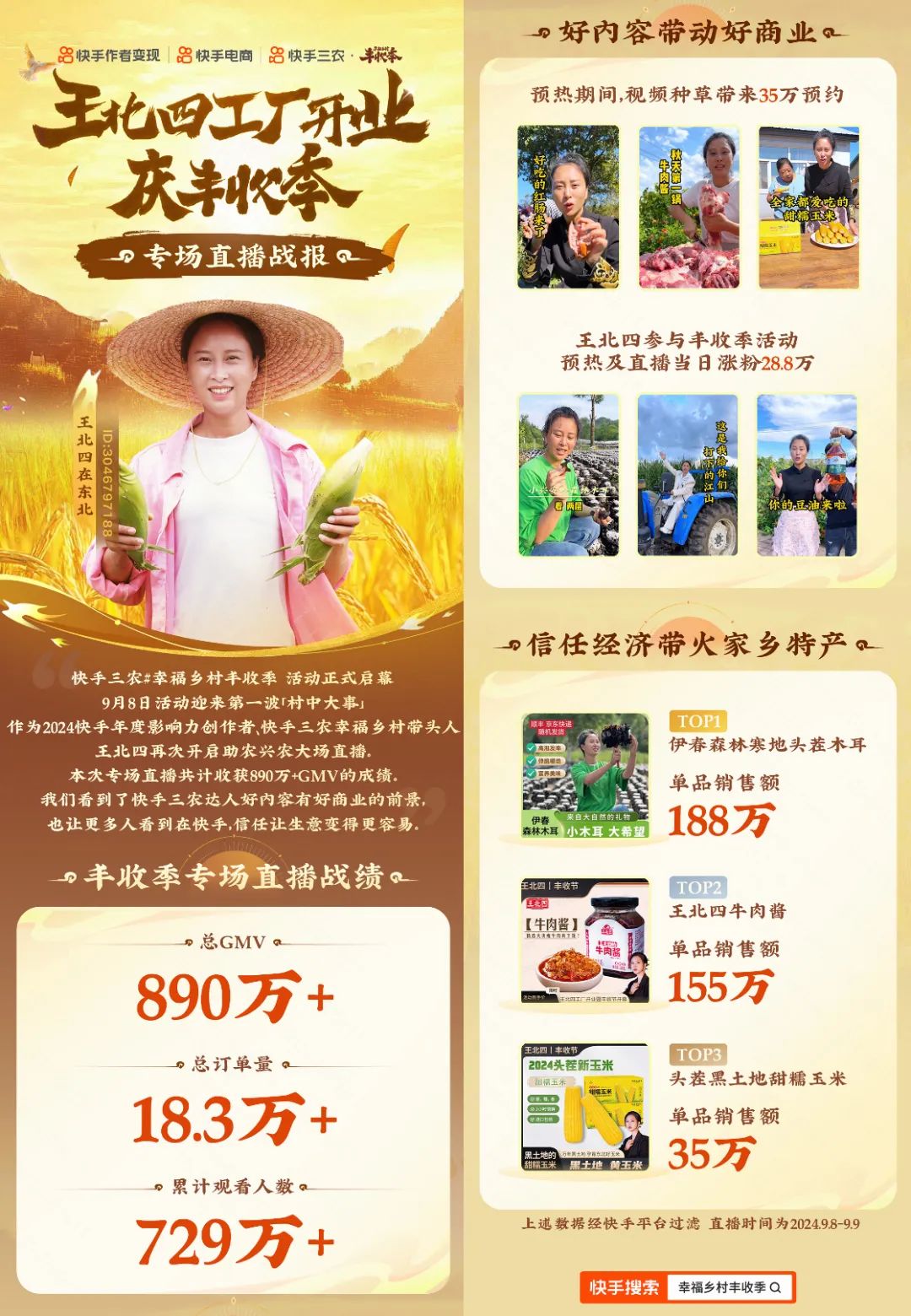 這一天,王北四在快手的助農興農的專場直播撬動了890多萬GMV,伊春木耳單品銷售額達188萬。