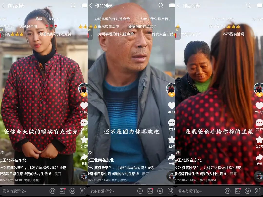 王北四出生於農村,熟悉這裏的一切。她喊來弟弟,舉起手機,以“王北四在東北”的名字,在快手嘗試更新。姐弟兩人,一人出鏡,一人拍攝。拍完後,王北四再用一天時間完成所有後期。記錄婆媳日常的第一條視頻,播放量超過兩百萬。