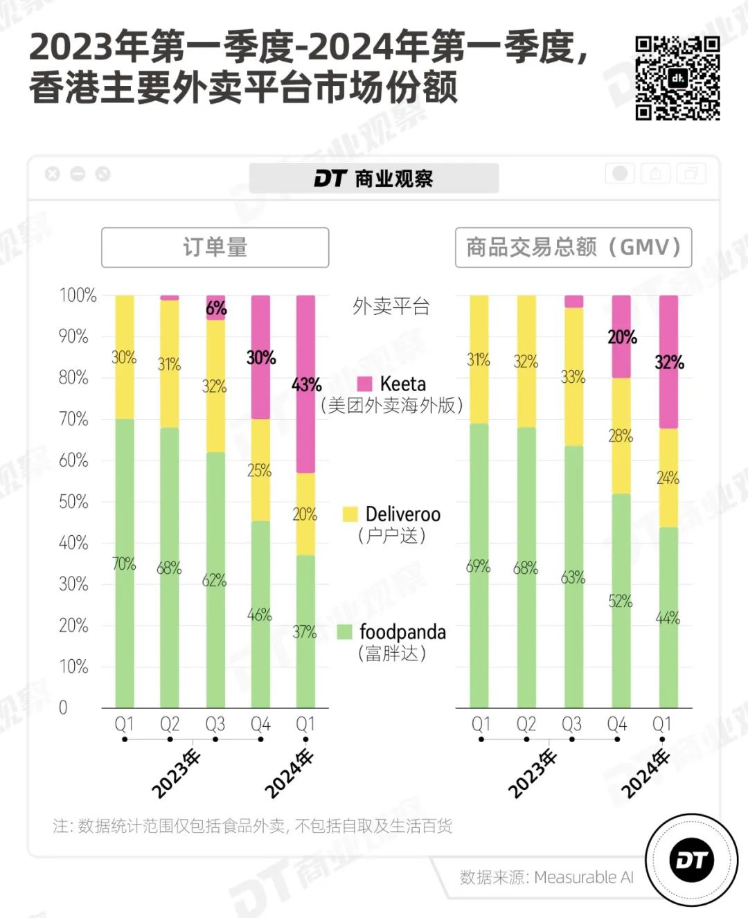 但由於Keeta的平均客單價較低,Keeta的商品交易總額(GMV)佔比(32%)目前仍低於Foodpanda(44%)。