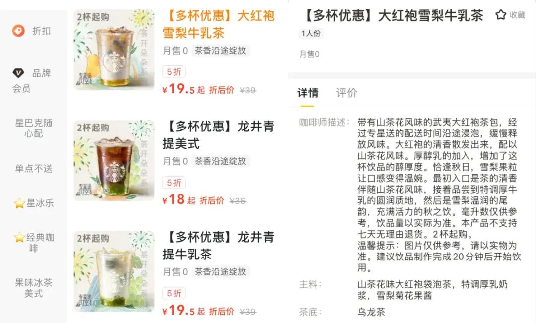 9月10日,星巴克上線新系列產品,且專供外賣渠道,其中除了兩款龍井青提美式和大紅袍雪梨拿鐵,還有兩款牛乳茶——龍井青提牛乳茶和大紅袍雪梨牛乳茶。