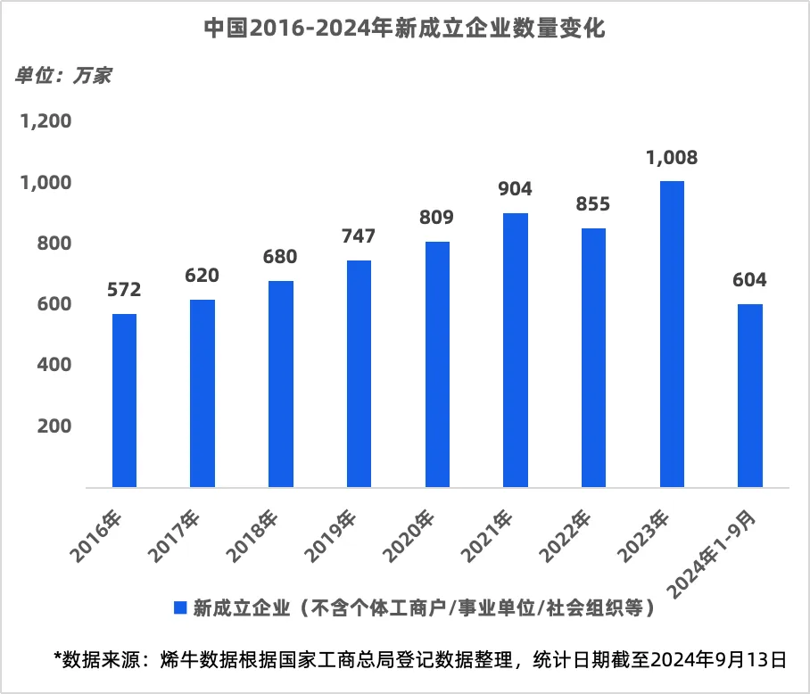 我們可以看到2016年到2024年中國新註冊成立的企業數量變化如圖。2018年680萬家,2023年1,008萬家,2024年截止到昨天604萬家,2023年相比2018年增長了48%,何來減少98%??
