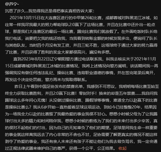 與埃沃洛主張類似的還有黑龍江冰城門將蘆寧和南京城市球員李鋭。蘆寧在自證中也交代了與李帥金錢上的往來,並闡述了接受公安機關調查的全過程。而李鋭則描述的更為細緻,全面覆盤了自己與另外兩名重點涉案人員左祿博和牟善韜,時間精確到了年月日。不過兩個人交代問題的思路類似,都是把所有的責任都歸於他人,表明自己是在不知情的情況下遭到利用。