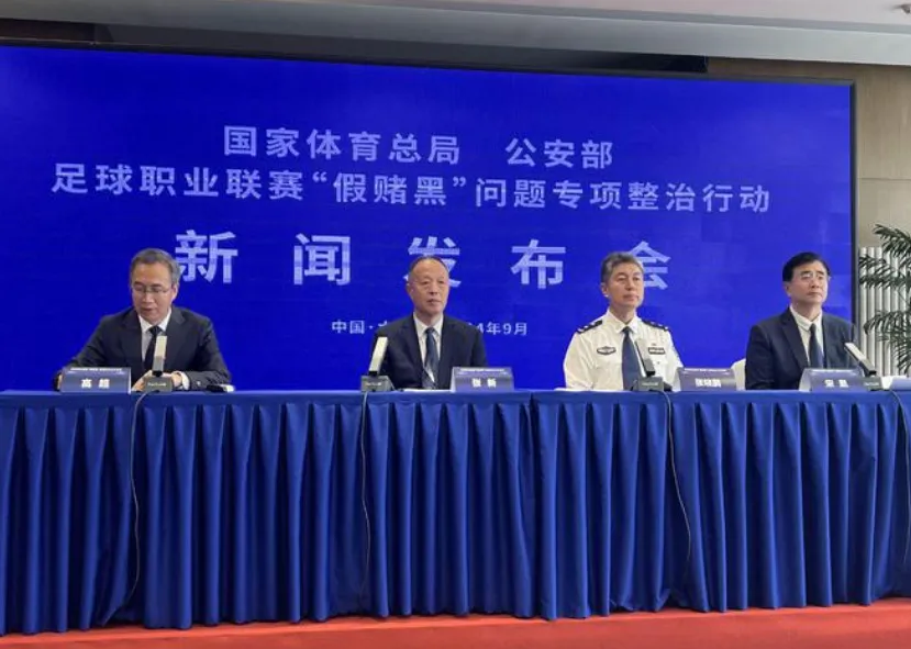 9月10日,在國足與沙特賽前,國家體育總局聯合公安部在大連召開了足球職業聯賽“假賭黑”問題專項整治行動新聞發佈會,體總競體司、公安部治安管理局和中國足協都派出負責人,介紹了中國足球“假賭黑”問題相關情況和最新進展,並公佈了第一批被處以終身禁足和禁足5年的球員名單。