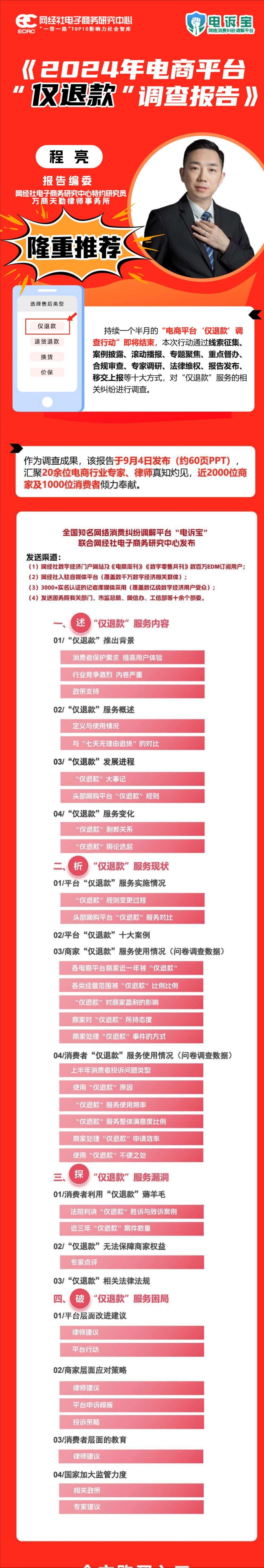 9月4日,網絡消費糾紛調節平台“電訴寶”聯合網經社電子商務研究中心發佈《2024年電商平台“僅退款”調查報告》。該《報告》匯聚20餘位電商行業專家、律師真知灼見,並由近2000位商家及1000位消費者傾力奉獻。