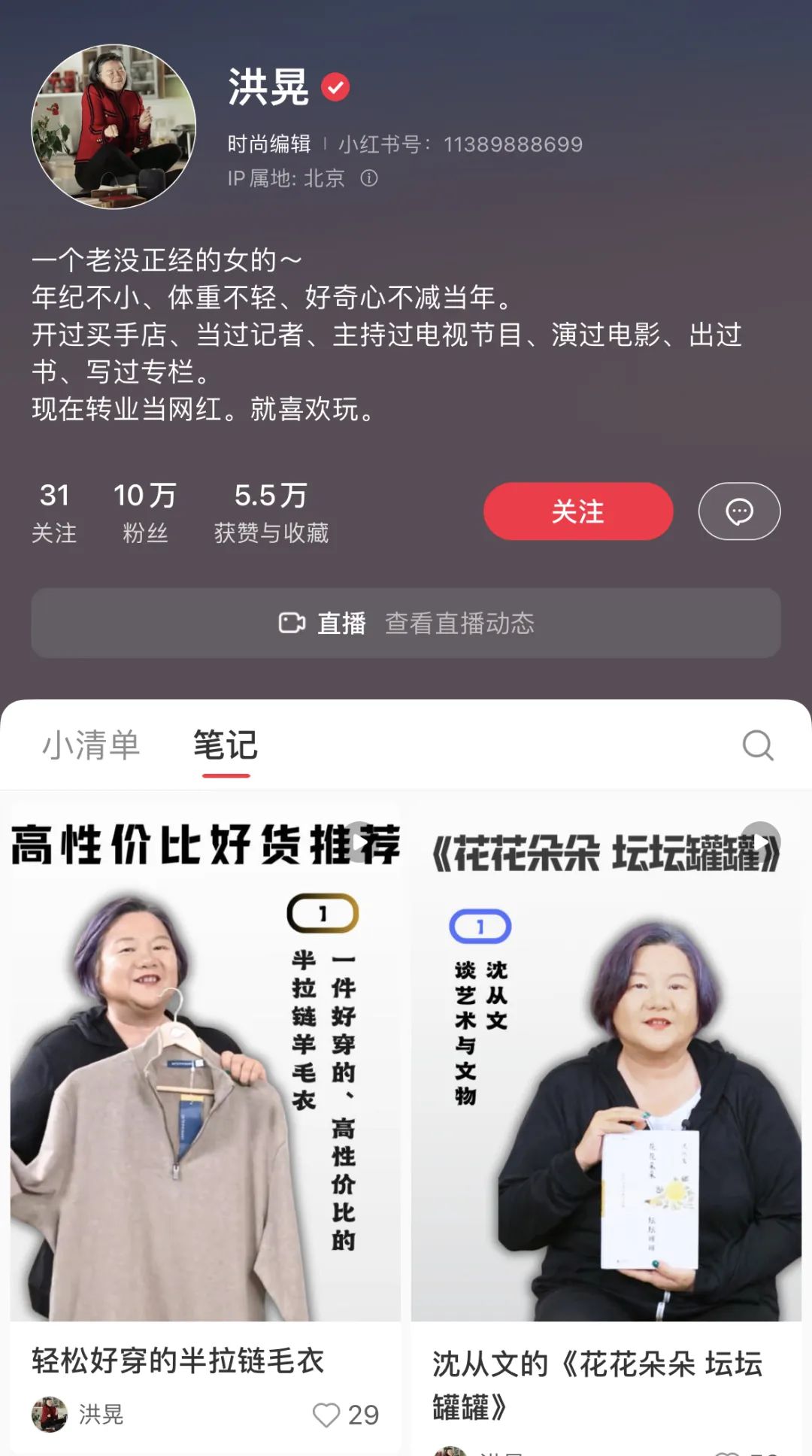同樣投身小紅書直播浪潮的名人還有洪晃。她被稱為“中國設計師的時尚教母”,曾出版主編了國內第一本專注中國原創本土設計的《世界都市 iLOOK》,成了不少人的時尚啓蒙。