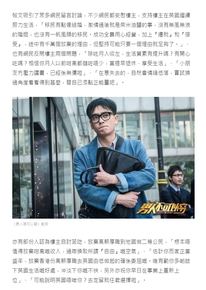 還有人説:“無意冒犯,但是不知道你有沒有想過,可能你根本就不值8萬一個月呢?你在香港是被過度估值了,所以才能拿那麼高的工資,到了英國才是正常水平。別掙扎了,面對現實吧。”