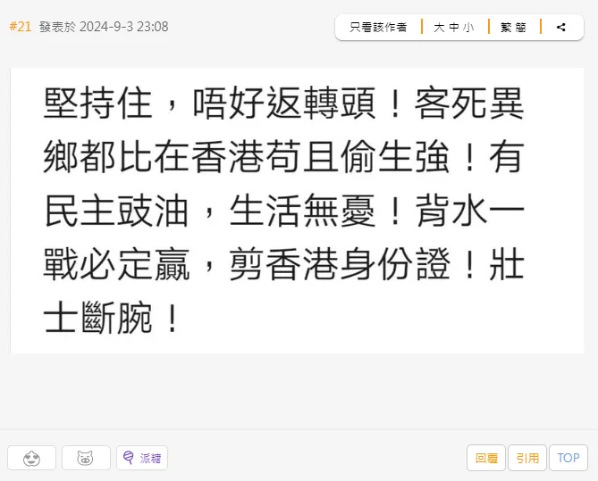 “堅持住,不要走回頭路!客死異鄉也比在香港苟且偷生來得強!有民主醬油,生活無憂!背水一戰一定贏,剪掉香港身份證!壯士當斷腕!”