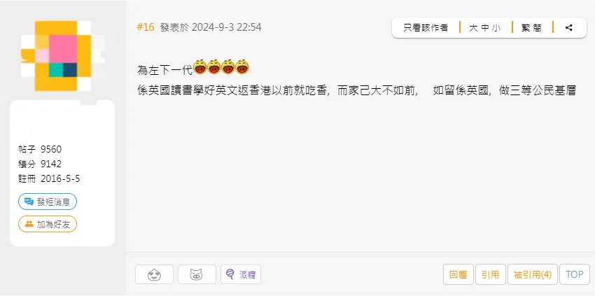 “狗屁為了下一代,以前在英國讀書吃香是回來香港好找工作,今時不同往日,如今留在英國只能當三等公民了。”
