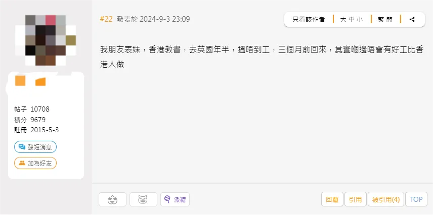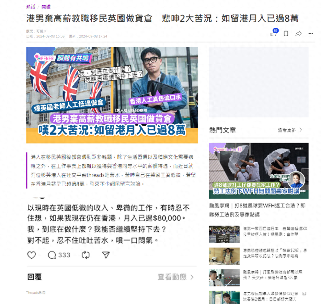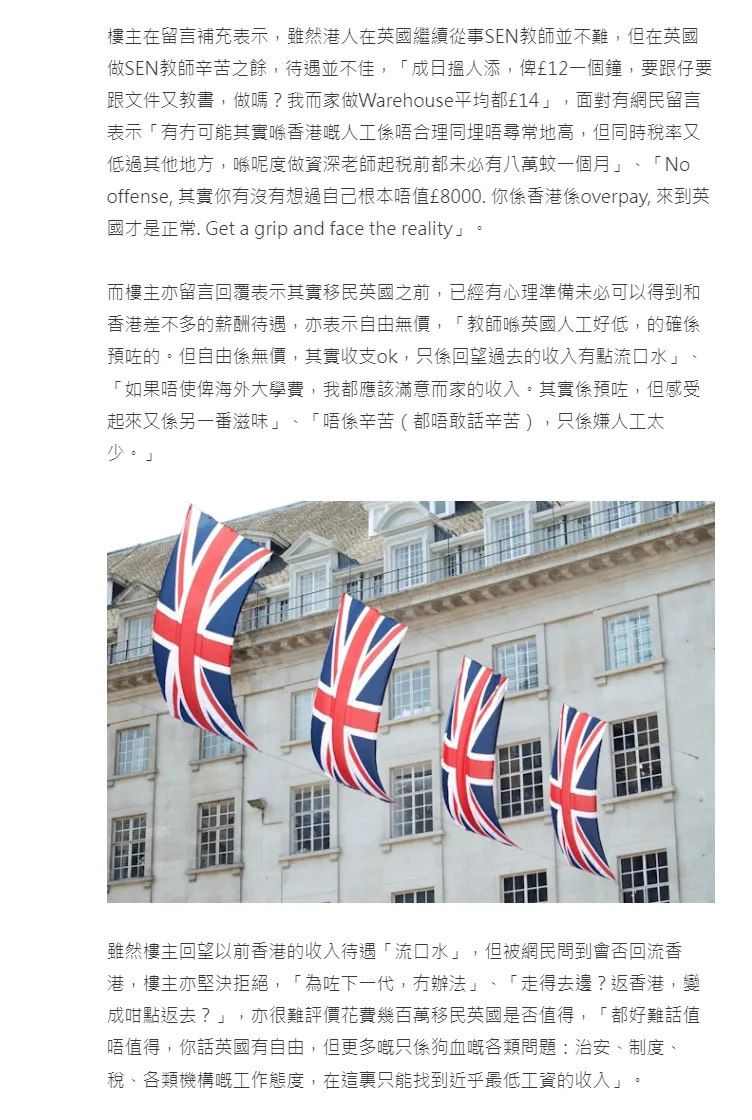 這兩天我在上網的時候刷到一條新聞,原始信源香港媒體“香港01”,主人公是一個潤英港人,他在潤英之前在香港幹着非常體面的教師工作,而潤去英國之後則只能靠給英國人看倉庫勉強餬口。這名男子因此忍不住在國外社媒平台上發帖吐槽,抱怨自己在英國的工資收入過於綿薄,如果當初選擇留在香港,後來可能早就月入超過8萬港幣了。