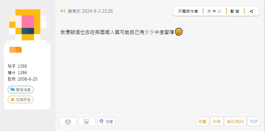 很難説那位“智障教師”在看到這些評論之後心裏頭是何滋味,不過我想這應該也是他拉不下臉回來香港的一個原因。幾百萬港幣都撒出去了,好不容易才潤到英國。我以前在香港你們就笑話我,我現在潤去英國你們還笑話我,那我不是白潤了嗎?你們還勸我回來?我在香港都社會性死亡了還怎麼回得來?如果混不出個人樣來就回去,那還不如干脆就在那邊熬一天是一天算逑。