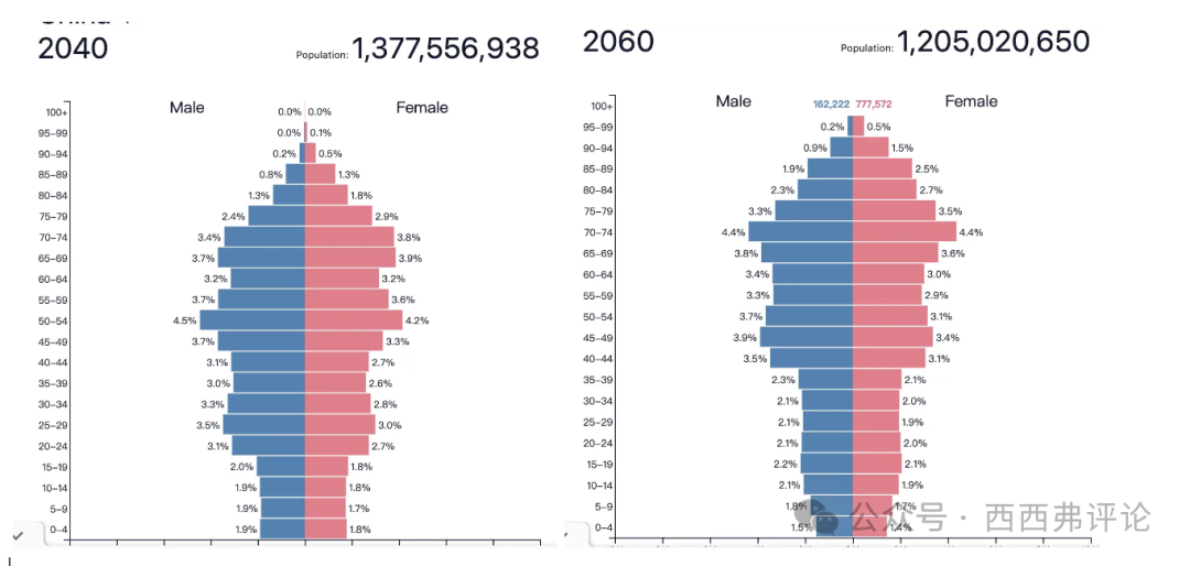 如果人口結構老齡化,倒金字塔,問題將會嚴重。下圖是一個比較樂觀的模型,2100年中國人口縮減到7.7億人。2040年,80後到60歲時,已經很明顯是倒金字塔了。2060年會更加明顯。