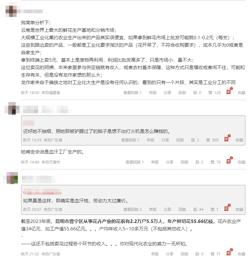 “這位賣花的阿姨,估計本來家裏參與供應鏈就有收入,或者是在農村有基本收入保障的。人家出來賣花可能只是為了增收,或者是閒不住,也有可能有一定生存的壓力,但是不至於説會像龍作家想得那麼嚴重。”