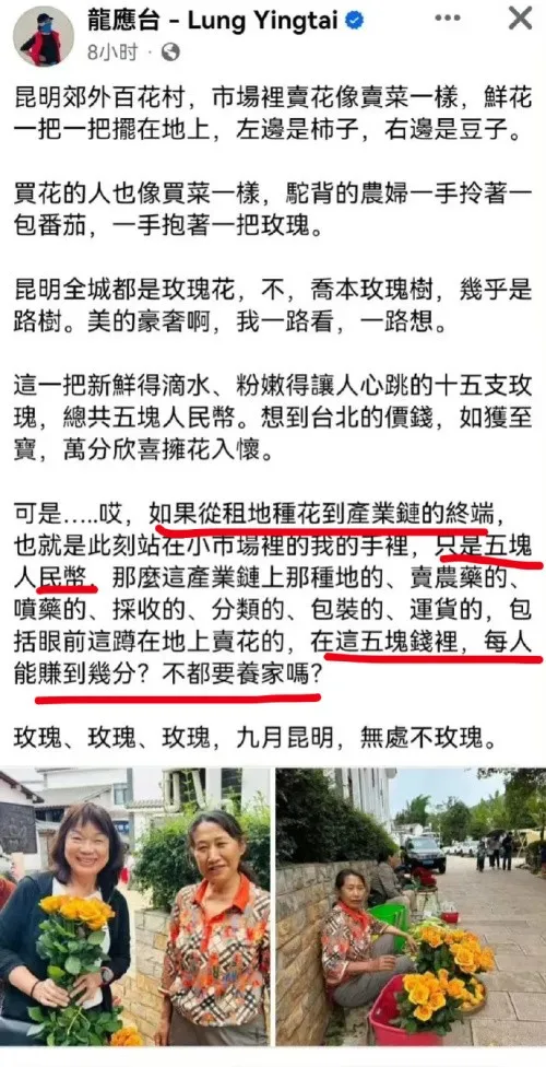 咱們的老熟人——台灣省閒人龍應台龍女士這兩天又在社媒平台上發她的“龍氏小確幸”小作文。大意是説:她在昆明的市場上買了一束玫瑰,又粉又嫩、鮮得出水,而且15支才賣5塊錢,這事讓龍應台反覆撿到了個天大的便宜,因為她一聯想到台北的花價,就賴清德治下的那個烏煙瘴氣的綠不拉幾的台偽政府的那揍性,她可沒法在那羣綠毛龜、王八蛋的手底下買到這麼物美價廉的花。